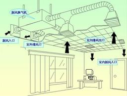 制冷制熱工作原理為:室外新鮮空氣經(jīng)新風口進入空氣處理室,經(jīng)過過濾器清除掉空調中的灰塵,再經(jīng)過表冷器、加熱器等設備的處理,使空氣達到設計要求的溫度和濕度后,由送風機經(jīng)風量控制系統(tǒng)送入風管系統(tǒng)送入消聲裝置降低噪聲后,經(jīng)過各房間風量調節(jié)裝置,由出風口送到各空調房間,吸收了房間里的余熱、余濕后,自回風口經(jīng)風道排出室外。